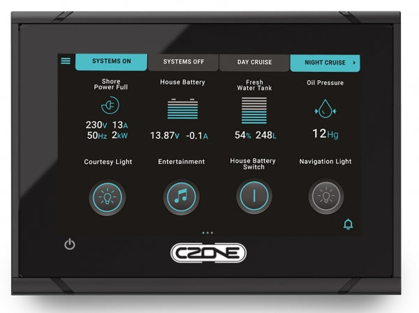 Imagine this: you hop onto your boat, hit one button, and have lights, outlets, generator, TVs, or anything you've configured to turn on, so that you can worry about loading gear and making sure your family is safe. You are ready to leave, you hit cruising mode, MFDs, nav lights, AIS, radar, or whatever you'd like to turn on or off: you are ready to go in the touch of a button. This is the dream that come true with the CZone Touch Interfaces, letting CZone do the thinking, so you can enjoy your time on the boat.