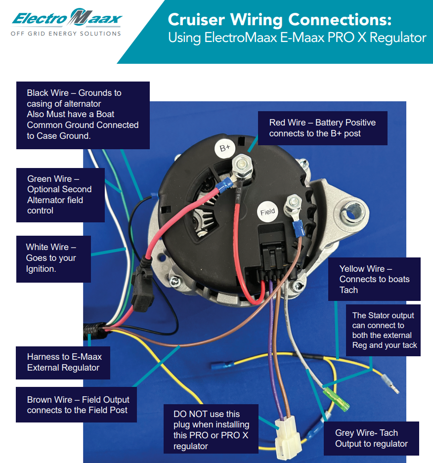The Cruiser line of alternators comes with a simple internal regulator. We only recommend using the internal regulator for charging small starting lead acid batteries. For larger house banks or lithium charging we recommend using an external regulator.