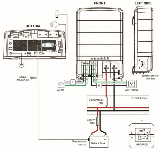 The CombiMaster comes default with a neutral to ground connection which is required by ABYC. That is a configurable setting for non-marine applications, adding versatility.